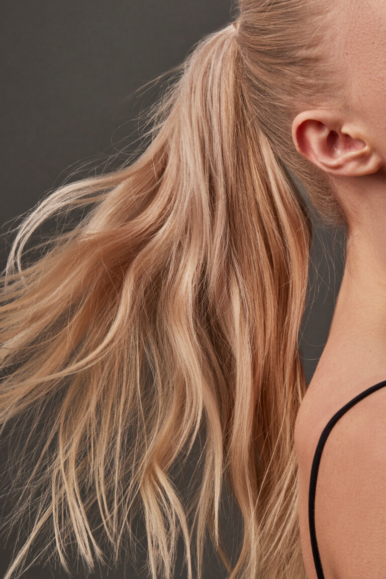 Kiinnitä hiukset joustavalla hiuslenkillä. Jos haluat viimeistellä ilmeen, ota pieni suortuva poninhännästä ja kierrä se hiuslenkin ympäri – näin saat siistin ja viimeistellyn lopputuloksen.