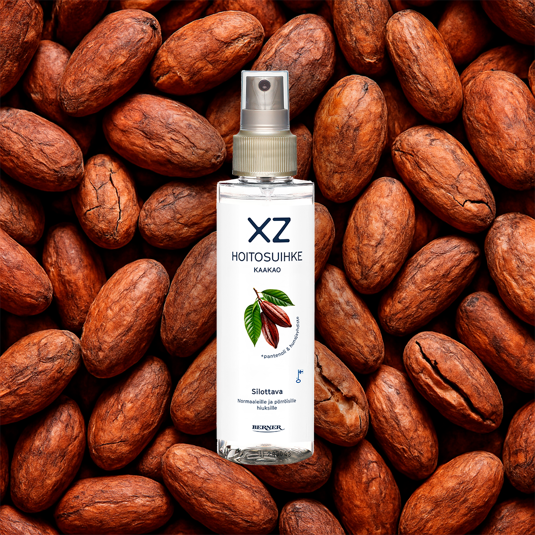XZ Kaakao hoitosuihke normaaleille ja pörröisille hiuksille. Suihke tekee hiuksista sileät, pehmeät ja helposti käsiteltävät. Suihke vähentää tehokkaasti hiusten sähköisyyttä ja antaa niille luonnollista kiiltoa, jättäen hiukset helposti selvitettäviksi ilman raskasta tunnetta. Hoitava koostumus sisältää hunajayhdisteen ja pantenolia, jotka kosteuttavat, silottavat ja suojaavat hiuksia ulkoisilta rasituksilta. Suklaisen kaakaon tuoksu viimeistelee hiustenhoitohetken.