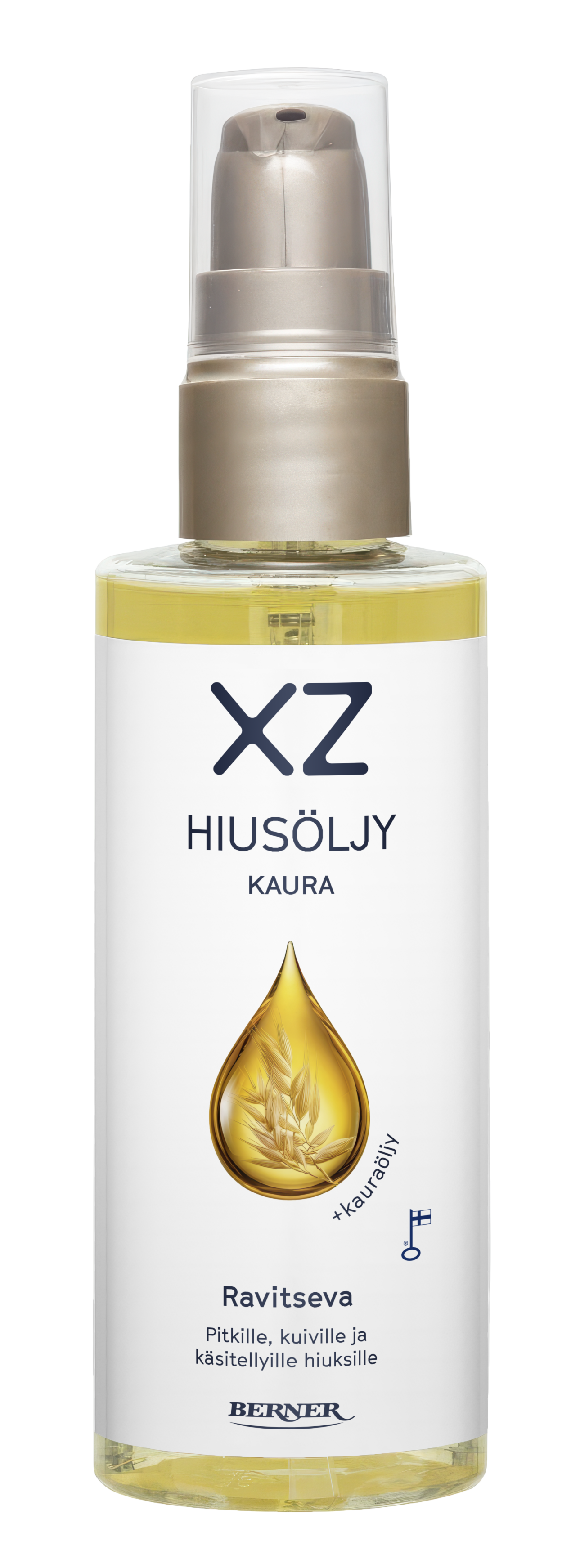XZ Kaura hiusöljy pitkille, kuiville ja käsitellyille hiuksille sekä kuivalle hiuspohjalle. Ravitseva hiusöljy kosteuttaa ja hoitaa hiuksia tehden niistä kiiltävät ja silkinpehmeät. Sen koostumus sisältää E-vitamiinia ja pohjoismaista kauraöljyä, joka kosteuttaa ja hoitaa hiuksia ja kuivaa hiuspohjaa tehokkaasti. Kauraöljyn sisältämät keramidit korjaavat hiusta, tehden hiuksista terveemmän näköiset ja tuntuiset. Hiusöljy vähentää pörröisyyttä ja korjaa vaurioituneita hiuksia. Luonnollinen lopputulos ilman latistavia silikoneja. Lempeä kaura-hunajainen tuoksu viimeistelee hiustenhoitohetken.