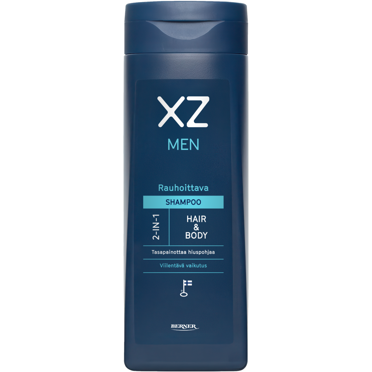 XZ MEN Rauhoittava shampoo puhdistaa hiukset ja hiuspohjan hellävaraisesti sekä auttaa ennaltaehkäisemään hilseen muodostumista. Shampoo rauhoittaa ja viilentää hiuspohjaa, mikä tekee siitä miellyttävän valinnan lievästä, ajoittaisesta hilseilystä kärsivälle hiuspohjalle. Raikkaassa tuoksussa yhdistyvät menthol ja eukalyptus, jotka viimeistelevät puhtaan ja virkistävän pesutunteen. 2in1-koostumus sopii sekä hiusten että vartalon pesuun. Sopii päivittäiseen käyttöön.