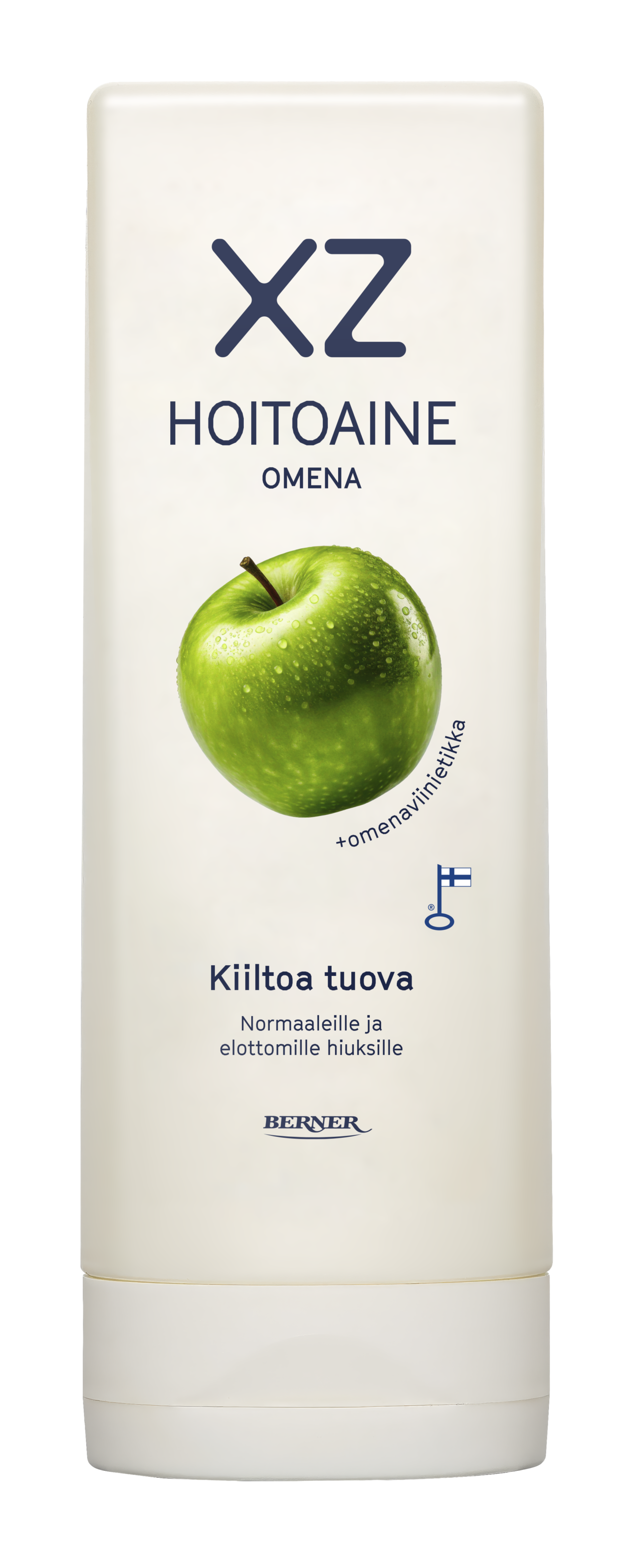 XZ Omena hoitoaine normaaleille ja elottomille hiuksille. Kiiltoa tuova hoitoaine auttaa säilyttämään hiusten luonnollisen kosteuden ja tekee hiuksista pehmeät ja helposti kammattavat. Hoitoaineen sisältämä omenaviinietikka tuo hiuksiin luonnollista kiiltoa, kun taas glyseroli auttaa ylläpitämään hiusten kosteustasapainoa. Raikas omenan tuoksu viimeistelee pesuhetken.